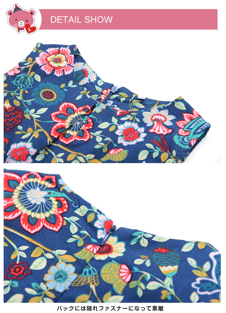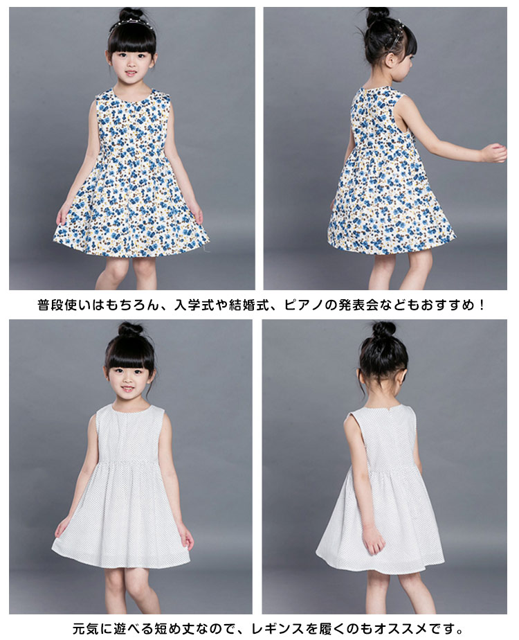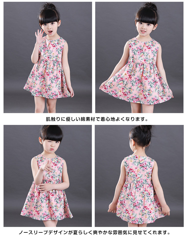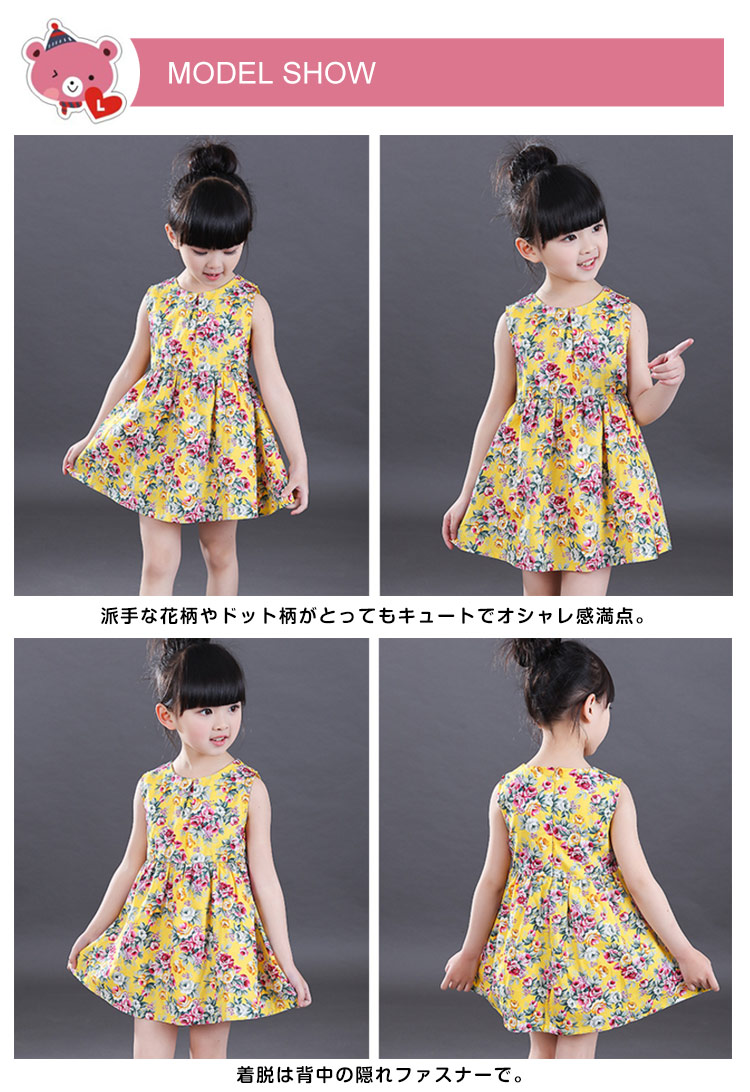 | 総柄が目を引くレトロ可愛いワンピース。派手な花柄やドット柄がとってもキュートでオシャレ感満点。着脱は背中の隠れファスナーで。肌触りに優しい綿素材で着心地よくなります。ノースリーブデザインが夏らしく爽やかな雰囲気に見せてくれます。普段使いはもちろん、入学式や結婚式、ピアノの発表会などもおすすめ!元気に遊べる短め丈なので、レギンスを履くのもオススメです。 | |