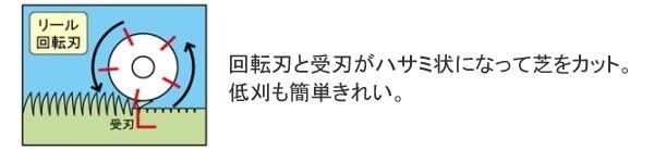 | 常に一定の力で受刃と回転刃がすり合う刃調整不要の特殊機構の手動式芝刈機です。 |