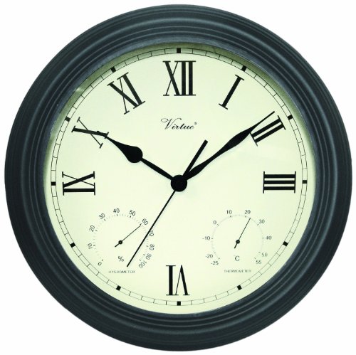 For outdoor or indoor use, this 12" diameter 3-in-1 weather-resistant clock features second-hand quartz movement and large easy-to-read Roman numerals, surrounded by a black metal frame. Thermometer and Hygrometer indicators are featured. Requires 1 AA battery - not included.