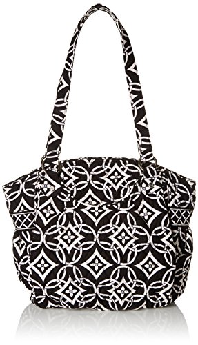 Dual shoulder straps. Exterior slip pocket. Flat bottom. Top-zip closure. Patterned interior features a back-wall zip pocket and multifunctional slip pockets.Feature