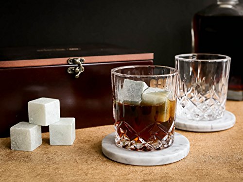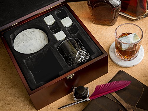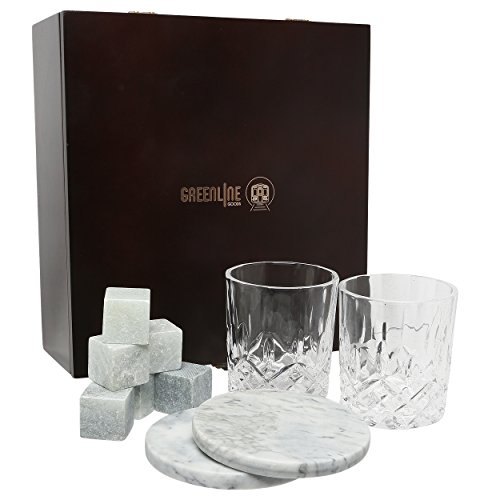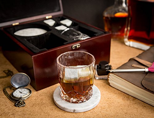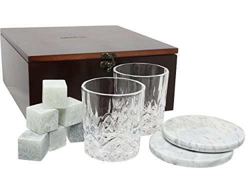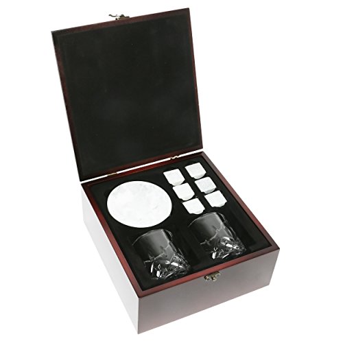 YOU WILL RECEIVE: (1) Engraved Wooden Gift Box (2) Diamond Cut 10 OZ Whiskey Glasses (2) White Marble Coasters - with Furniture Protecting Foam Bottom (6) Soapstone Whiskey Rocks 0