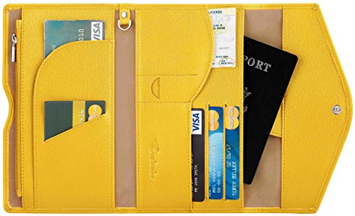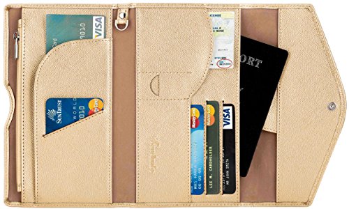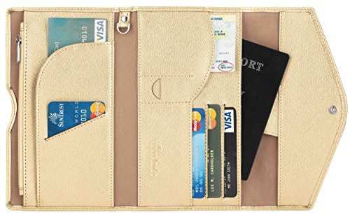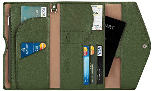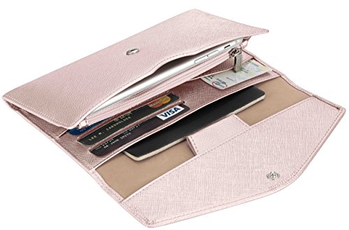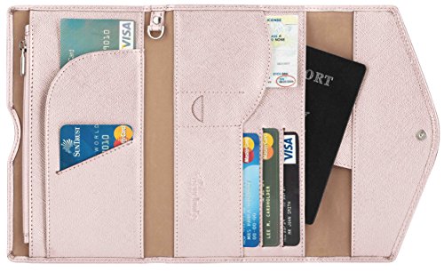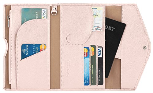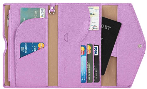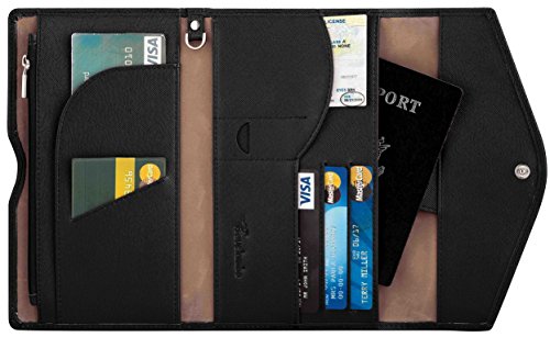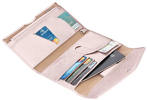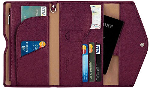 3. VARIOUS FUNCTIONAL SLOTS --1 passport pocket (max fit 2-3 passports), 3 credit card slots, 1 id slot, 1 sim card pouch, 1 ticket slot, 1 coupon compartment, 1 cellphone pouch (max 5.8 inches), 1 money & coins zippered pocket (fit U.S. money), 1 key holder and 1 pen holder;