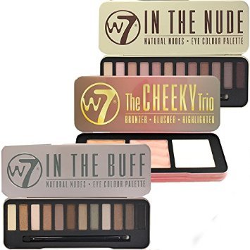 In the Buff Eye Colour Palette from W7. Comes complete with double ended brush and these are easy to blend. Contains 12 eyeshadows: Buff, Camel, Sand, Dust, Chocolate, Topaz, Earth, Storm, Silk, Wave, Thunder, Onyx In the Nude Eye Colour Palette from W7. Natural Nudes Eye Colour Palette. Comes with double ended applicator brush Latte, Angel, Venice, Marilyn, Copper Pot, Sun Kissed, Alice, Bad Manners, Coffee Cup, Mud Slide, Tokyo, Fashionista W7 cheeky trio bonzer - blusher - highlighter 21g. The only palette you need to shade, highlight & define. This palette Contains three face essentials Colours included: dream machine, 5th avenue & hot stuff.Feature
