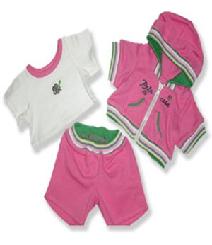 -. Feature : Pink teddy bear sweatsuit / pink outfit with green and pink trim / white t-shirt with pink trim / fits 15 inch plush / includes hoodie, pants and shirt