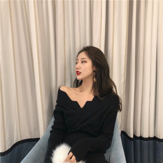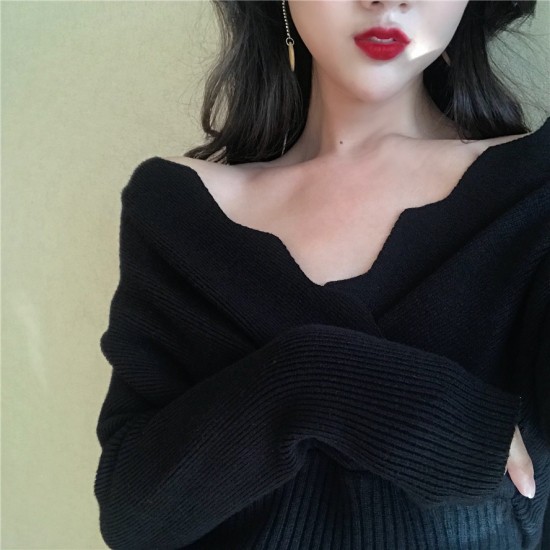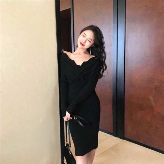 ドレス ワンピース オフショルダー風 Vネック 膝丈 長袖 タイト シック 可愛い パーティー お呼ばれコーデ drgz1532