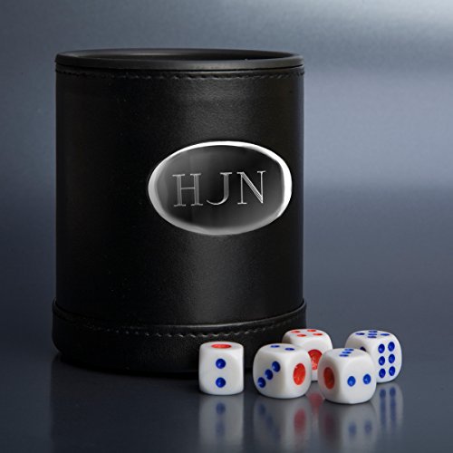 Studio : JDS Publisher : JDS Binding : Toy Product Description Wrapped in black leather with handsome matching stitches, our personalized dice cup is the perfect addition to your favorite gamer's collection. Ideal for a variety of dice games, it includes an attractive silver-toned engraved plaque as well as 5 standard dice with red and blue dots. A unique personalized gift! Personalized with two lines of up to 15 characters. 0