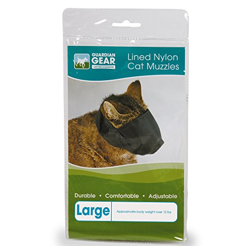 Studio : PetEdge Dealer Services Publisher : PetEdge Dealer Services Binding : Misc. Product Description Pet care professionals choose our Guardian Gear nylon cat muzzles to help stop biting and chewing by difficult cats. Made from strong nylon fabric with a fully adjustable strap and Velcro fasteners for an easy fit. Easy for owners to use but hard for cats to remove. Place muzzle over the cat's snout. Make sure it fits comfortably. Bring straps behind cat's head and fasten Velcro tabs. Adjust Velcro so muzzle fits snugly, but not tightly. Use only with direct supervision. Do not leave cat muzzled for long periods of time. Prolonged use of a muzzle inhibits cat's natural cooling system, which can result in a life-threatening situation for the animal. Seller makes no warranty, expressed or implied, when this product is used on cats known to be vicious. Available in black color. Use for large cats over 12-pound weight. Measures 7-4/5-inch length by 4-4/5-inch width by 1/2-inch height. 0