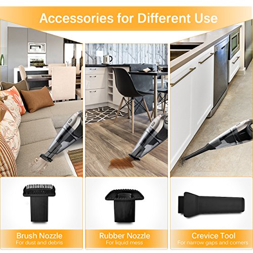 This handheld vacuum cleaner comes with two more nozzles that ensure efficient clean-ups in the narrowest places. Also, there's a small brush on the tip of the nozzle. Therefore, this small cordless handheld vacuum cleaner ensures the efficient cleaning of stairs, floors, carpets, shelves, and so on.