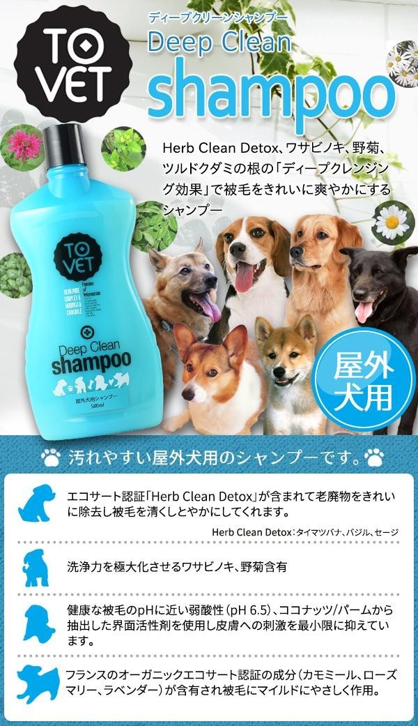 ハーブクリーンデトックスやワサビノキ、野菊、ツルドクダミの根の「ディープクレンジング成分」で被毛をきれいに清浄にするシャンプーです。 |