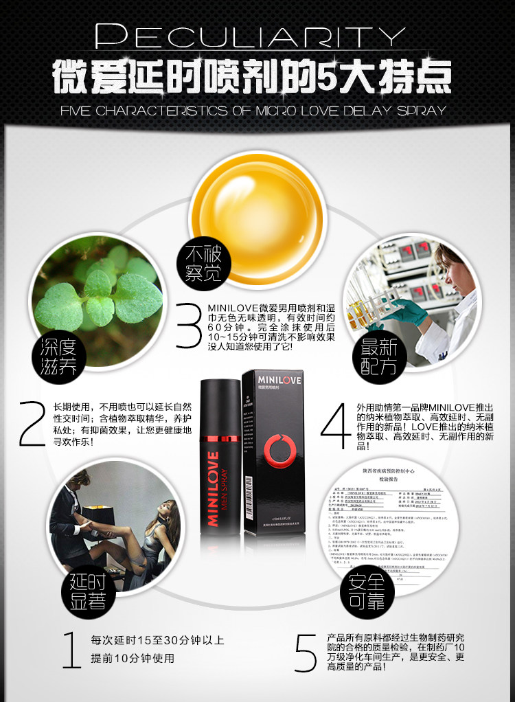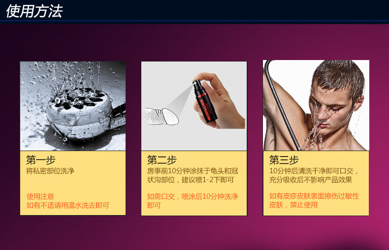 喷在阴茎头和性交前3至4次,每次20分钟,阴茎的轴的底部。本产品可以持续60分钟相比更多
