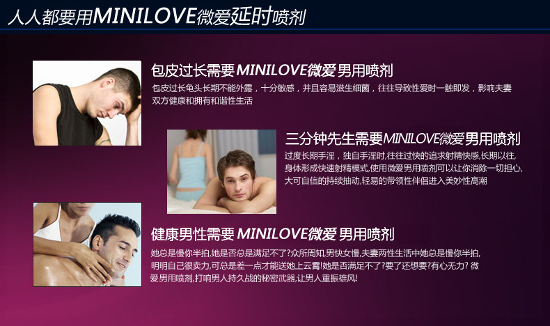 Minilove Spray is a spray to delay ejaculation and give lasting pleasure in sex. Minilove extracted from natural plants and it will give you high-quality sexual experience and allows you to enjoy sex more enjoyable safely.