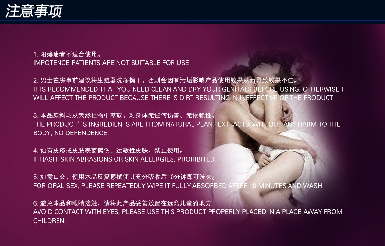 Spray on the penis head and the bottom of the shaft of the penis of 3 to 4 times 20 minutes before sexual intercourse. This product can last for more than 60mins.