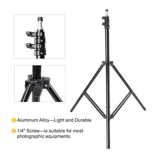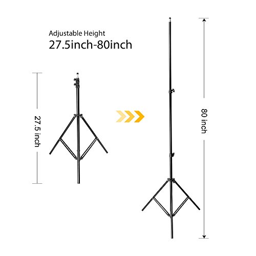 (2) x 80"/200cm Tall Studio Light Stand Adjustable Height: 70-200 cm/ 27.5-80 inches 1/4" Screw: suitable for most photographic equipments. Quick Release Levers: allowing full and smooth height adjustment Aluminum Alloy construction: Light and Durable