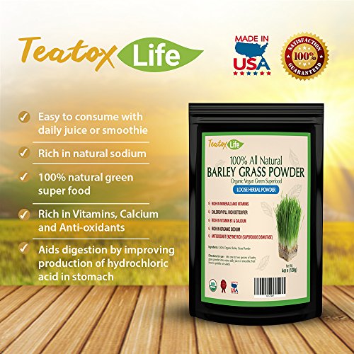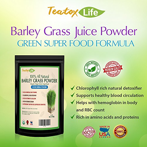 -. Feature : Teatox Life Barley Grass Powder for Juice Organic Barley Green Superfood, 120 grams of certified organic pesticide and gluten free raw green vegan super food / Green Barley grass juice powder is rich in vitamins A, C, B and minerals iron, calcium, potassium, magnesium, and phosphorus, and is very high in absorbable protein and contains 20 amino acids, including 8 of the essential amino acids the body doesn't produce itself. / Barley Grass Powder comes from the potent juice of an energy-rich grass that cleanses, detoxifies, nourishes and heals / Barley Grass Green Powder strengthens the immune system, alkalinizes the body, increases energy, aids digestion, helps relieve constipation and improves the health of skin, hair and nails. / Simply add to water, smoothie or juice and drink anytime of the day. Satisfaction guaranteed.