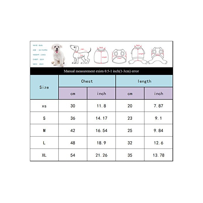 ●XS 배길이25cm,가슴둘레30cm ●S 배길이25cm,가슴둘레36cm ●M 배길이25cm,가슴둘레42cm ●L 배길이32cm,가슴둘레48cm ●XL배 길이35cm,가슴둘레54cm
