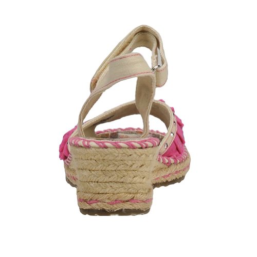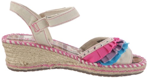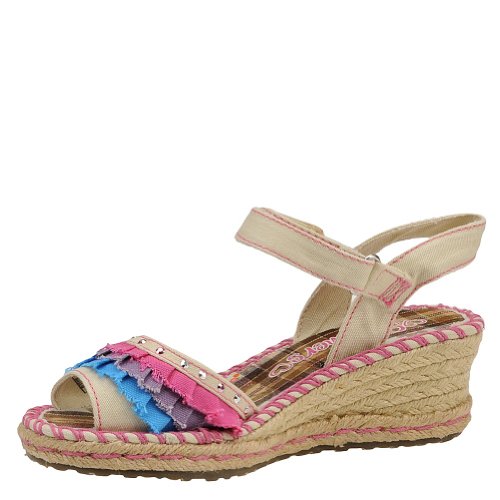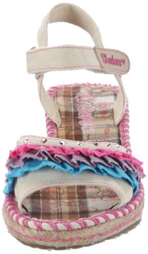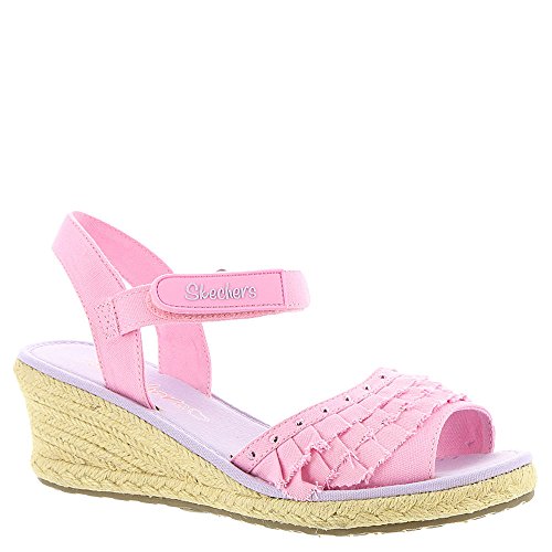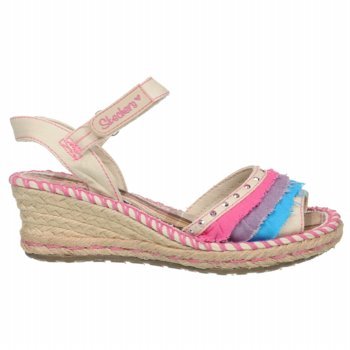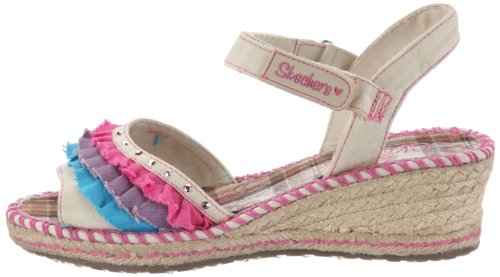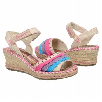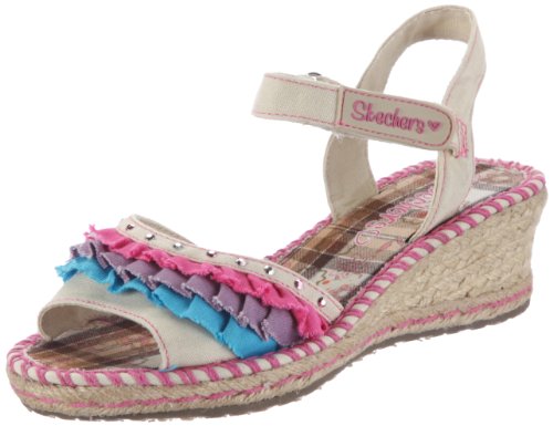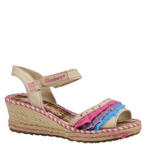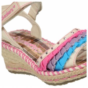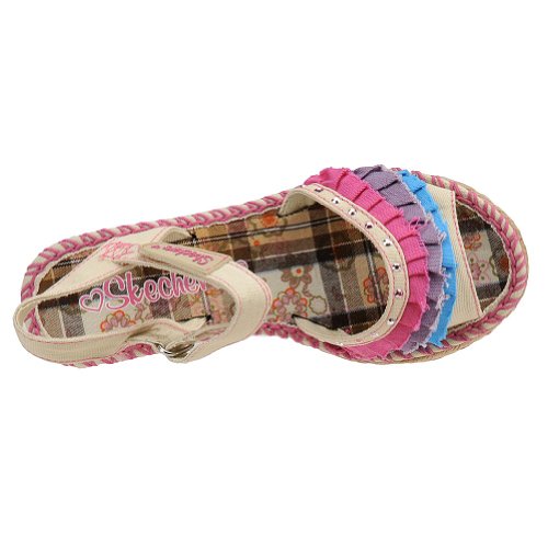 Binding : Apparel Product Description Fun summery fashion she'll love to wear comes in the SKECHERS Cali Tikis - Ruffle Ups sandal. Soft fabric upper in a wedge heeled ankle strap dress casual espadrille slide sandal with stitching accents, sequin detail and fun ruffles. 0