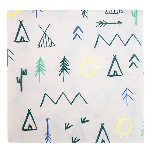 Product Description Featuring a cool pattern of tepees, arrows, mountains and trees, these stylish party napkins are perfect for a troupe of little adventurers as well as die cut plates or napkins featuring a bear face. 0
