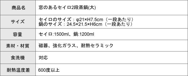 | 仕様 | 耐熱温度差:600度以上 容量:セイロ:1500ml×2、鍋:1200ml 食洗機使用可能 対応熱源:直火 |