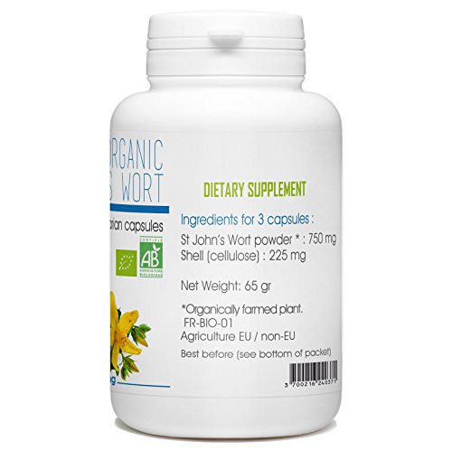 -. Feature : Organic St. John's Wort 200 mg - 200 Veggie Capsules / Organically farmed plant / 2 to 3 capsules a day with a large glass of water during meals and as part of a balanced diet.