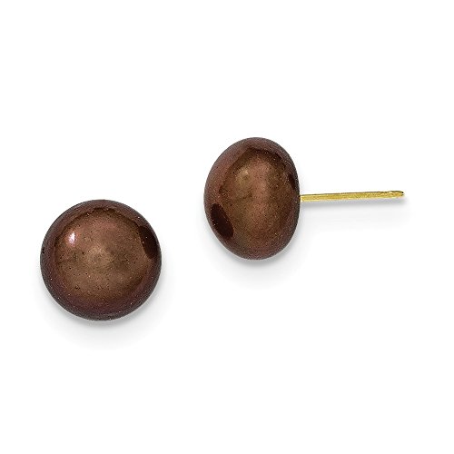 Solid 14k Yellow Gold 9-10mm Coffee Button FW Cultured Pearl Stud Earrings