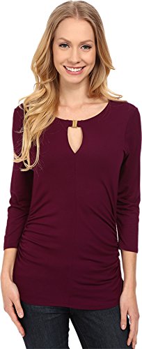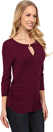 Flaunts a flirty keyhole cutout with metallic clasp. Round neckline. Three-quarter sleeve design. Side ruching creates a draped look. Curved hemline. 96% rayon, 4% spandex. Machine wash cold, tumble dry low. Imported.