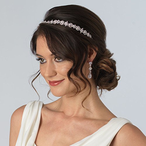 Art deco is in, and this art deco inspired bridal headband was designed just for the bride who loves that distinctive 1920s style. The details - which include three sizes of rhinestones and vintage style metalwork that adds a touch more glamour - are straight out of the flapper era. Which isn't to say you can't wear it without knowing the history of the age - the delicacy of this piece pairs wonderfully with simple and ornate gowns alike. This bridal headband measures approximately 14" from pin loop to pin loop and 3/4" wide, and is perfect for brides creating a vintage inspired wedding day ensemble, bridesmaids who have that inner sparkle, and anyone celebrating a special occasion.Feature