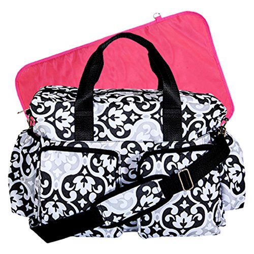 - Feature : Black, white, and gray scroll pattern rip-stop nylon with raspberry rose nylon lining / Top handle straps and adjustable, removable shoulder strap / Removable stroller straps for easy attachment to stroller / Easy-access zippered top closure / 2 exterior front zippered pockets; 2 extra-large exterior zippered pockets