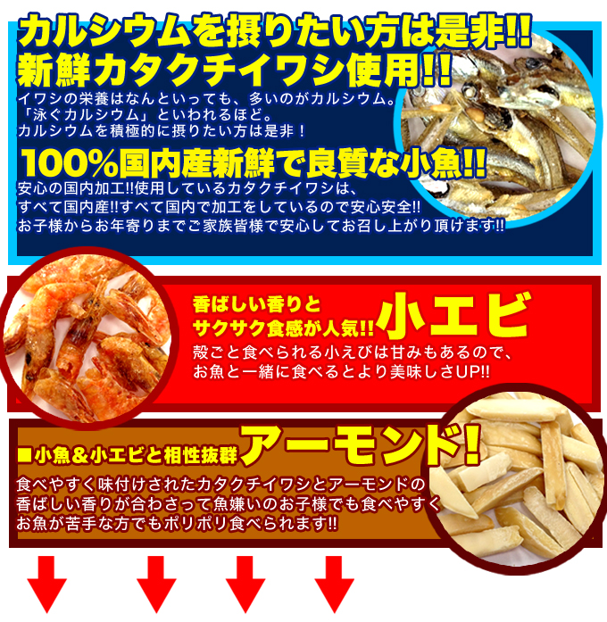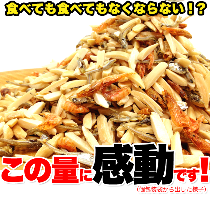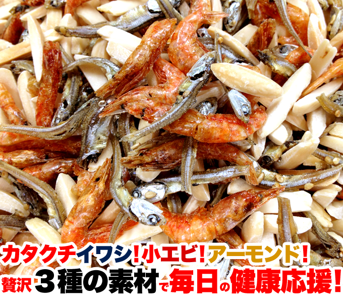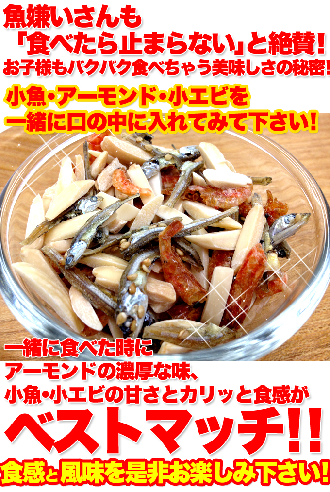 ●原材料名:アーモンド、かたくちいわし、えび、砂糖、食塩、ごま、唐辛子、調味料(アミノ酸)