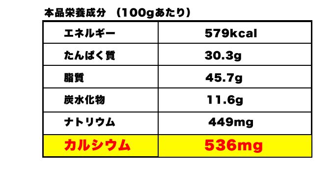 ●<栄養成分>100gあたり:エネルギー579kcal/たんぱく質30.3g/脂質45.7g/炭水化物11.6g/ナトリウム449mg/カルシウム536mg