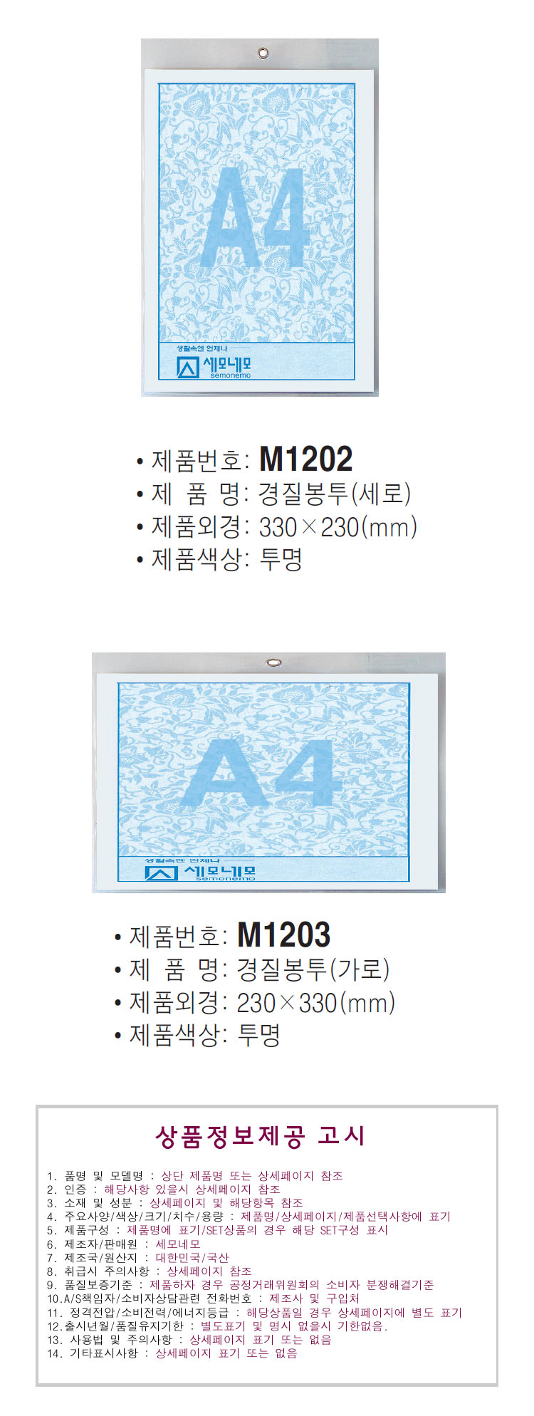 - 품명 및 모델명A4경질봉투(5개입)(M1202/M1203)(가로형/세로형택일)