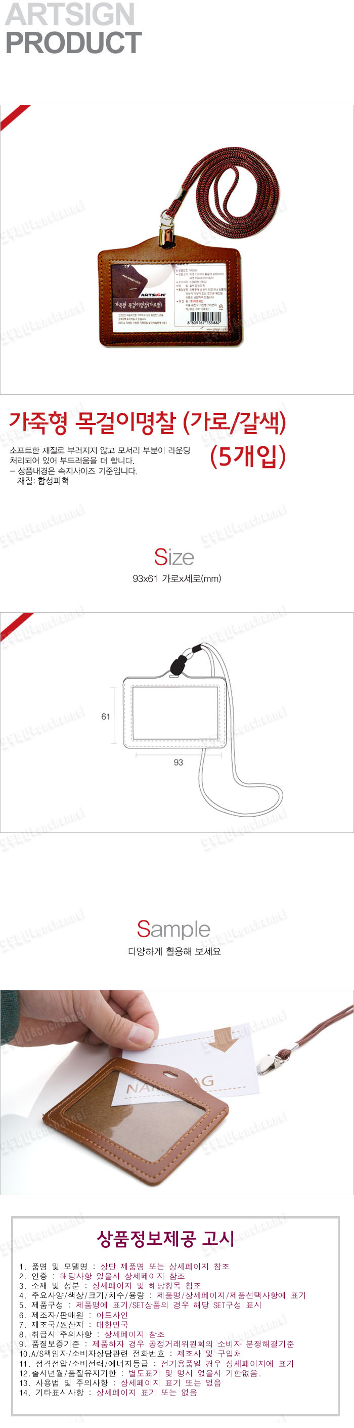 - 품명 및 모델명가죽형명찰(갈색/가로/93x61mm/5개입)