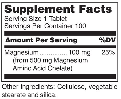 Highly absorbable chelated magnesium provides 100 mg elemental magnesium per tablet. Magnesium is involved in energy metabolism, and is notably important in the heart, skeletal muscles, and nervous system.