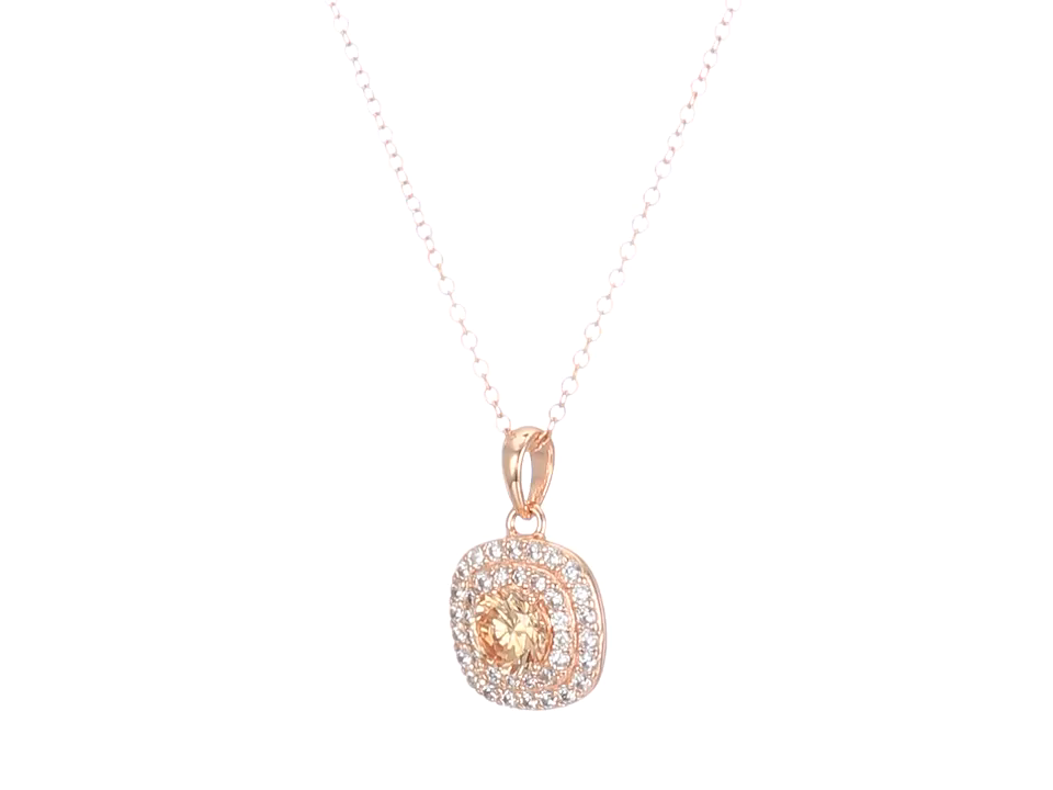 Rose Gold Plated Sterling Silver Round Champagne Cubic Zirconia 6mm and White Cubic Zirconia Double Halo Pendant Necklace, 18"