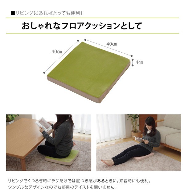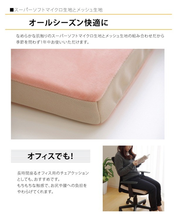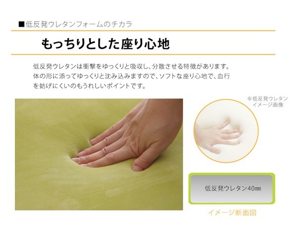 もっちりした座り心地のクッションです。シンプルなデザインなので、お部屋のテイストを問いません。リビングでのくつろぎ時、ラグだけでは底つき感があるときに、また来客時にも便利です。長時間座るオフィス用のチェアクッションとしてもおすすめです。もちもちな感触でお尻や腰への負担をやわらげてくれます。表地は、なめらかな肌触りのスーパーソフトマイクロ生地とメッシュ生地の組み合わせなので季節を問わずオールシーズンご使用頂けます。中材にはウレタン40mmを使用しています。低反発ウレタンは衝撃をゆっくりと吸収し、分散させる特徴があります。体の形にそってゆっくりと沈み込みますのでソフトな座り心地で血行を妨げにくいのもうれしいポイントです。