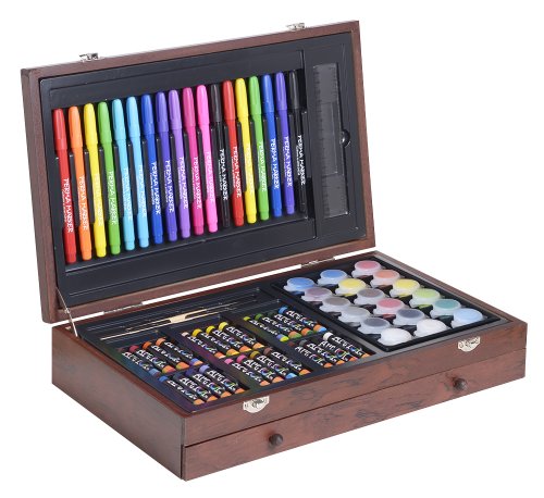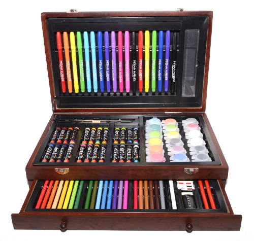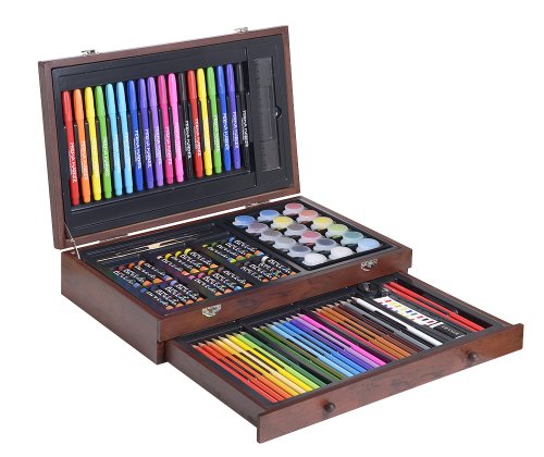 - Feature : Everything your budding artists needs to create a masterpiece all nicely contained in a wooden case / This set contains: 18 permanent markers, 18 poster paints, 24 color pencils, 24 oil pastels, 2 sketch pencils, 2 paint brushes, 1 color chart / And 1 ruler, 1 eraser, 1 pencil sharpener, 1 wooden case with drawer / Just add creativity and your artist is set