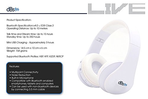 - Feature : Maximum bass and loudness level: Because it is a "closed-back headphone", meaning it cups your ear, it offers great maximum bass and loudness quality making it the best Bluetooth workout headphones. The way it fully enclose your ears allow you to hear anything (song, messages, calls) in precise detail and experience full-on bass because outside noises are blocked and only crisp sound is sealed in. / Convenience: The dBs wireless headset Bluetooth headphones allow automatic connection to any new Bluetooth device. It's a stereo headset without the messy cables. But if you have a device that doesn't support Bluetooth, we have included a 3.5mm cable to accommodate this. / Extensive music and talk time from Bluetooth 4.0: The dBs Bluetooth gaming headset with mic has a music time and talk time of up to 15 hours and stand-by time of up to 250 hours. The possible number of activities you can do with these headphones are endless. It only needs a maximum 3 hour charge time and you're off to your daily morning jogs at the park or your usual care-free chat with your friends. These bluetooth sport headphones are exceptional. / Comfort and Style: These cool Bluetooth audio headphones are suitably cushioned to let you listen to long hours of music without too much pressure on your ears. Its light weight headband design is comfortable and is less of a hassle to carry around on your head. The Bluetooth headset is available in black and red, white and light blue, plain black and plain white. / Major Bluetooth profiles supported: Being able to support HSP (Headset Profile), HFP (Hands-Free Profile), A2DP (Advanced Audio Distribution Profile) and AVRCP (Audio/Video Remote Control Profile) gives a wide variety of devices you can connect these best wireless headphones to. These are perfect Bluetooth headphones for iPhone 5, use it as your Samsung Bluetooth earphones or for any of your android and iOS devices.