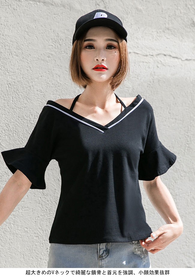 超大きめのVネックで綺麗な鎖骨と首元を強調、小顔効果抜群