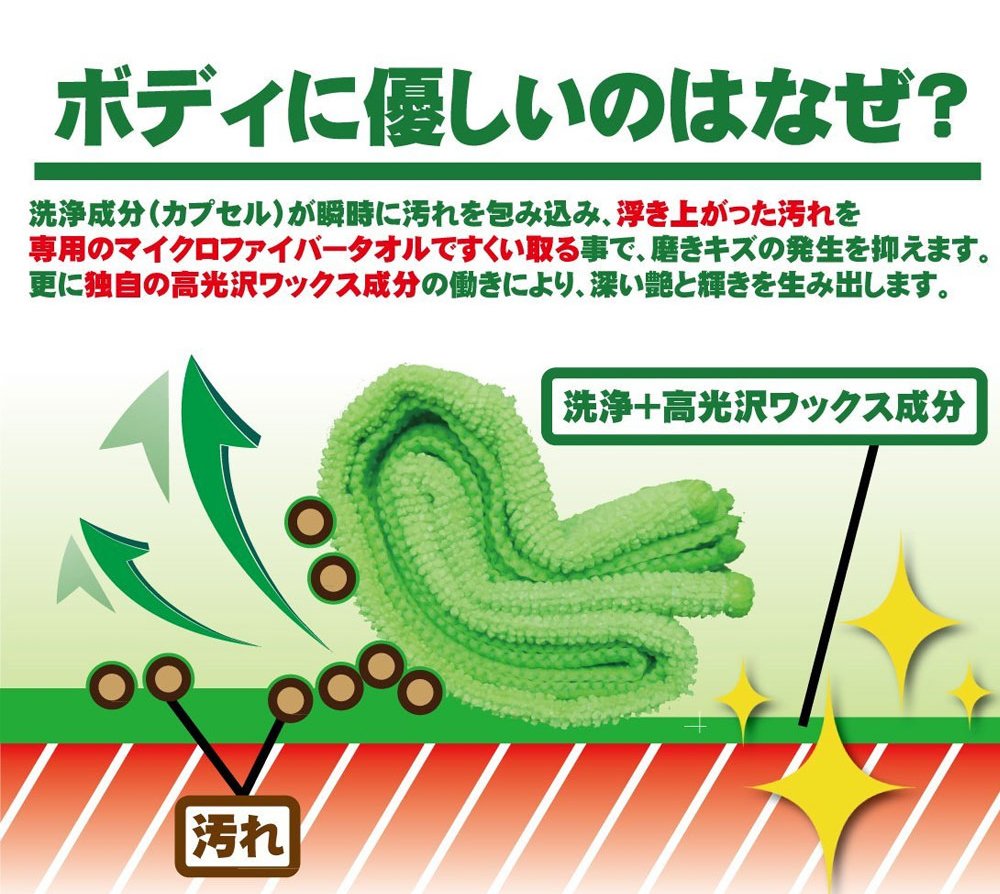 The unique cleaning ingredients envelop the dirt, gently scoop up the floating dirt with a microfiber towel, so as to suppress rubbing dirt on the body, suppressing occurrence of car wash scratches.