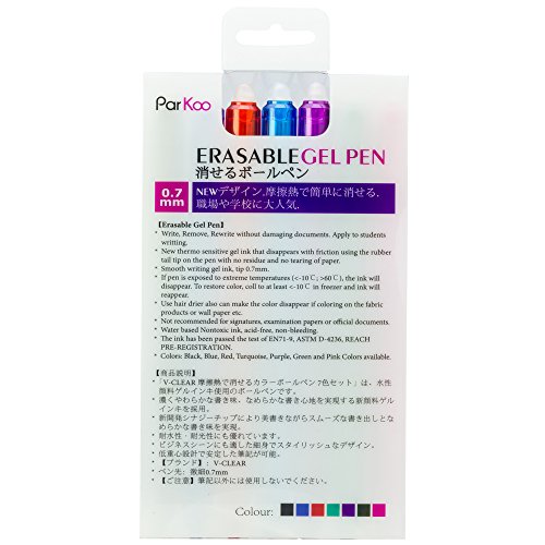 -. Feature : ✔ Write, Remove, Rewrite without damaging documents. Tip is retractable, eraser is at the top of the pen. / ✔ New thermo sensitive ink that disappears with friction using the rubber tail tip on the pen with no residue and no tearing of paper. / ✔ Smooth writing gel ink, tip: 0.7mm. Nontoxic ink, acid-free, non-bleeding. / ✔ 7 assorted colors - Black, Blue, Red, Green, Purple, Pink, Turquoise / ✔ Not recommended for use on legal or official documents