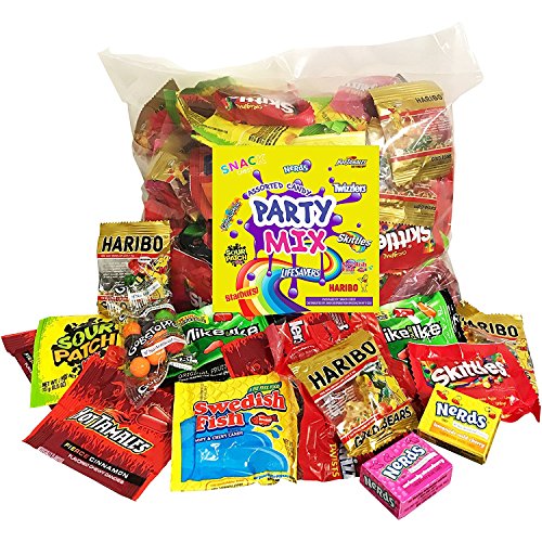 -. Title : Assorted Candy Party Mix Bulk Bag 3 Lbs Twizzlers Nerds Swedish Fish Sour Patch Skittles Starburst Mike And Ike Gummies and Much More of Your Favorite Treats Individually Wrapped (48 oz)