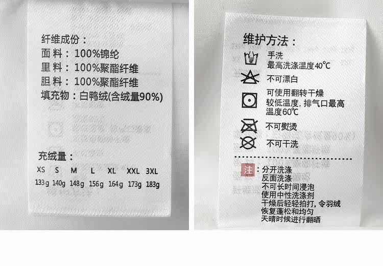 | 面料成分: | 面料:100%锦纶 里料:100%聚酯纤维 胆料:100%聚酯纤维 |