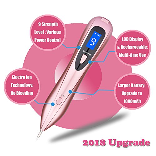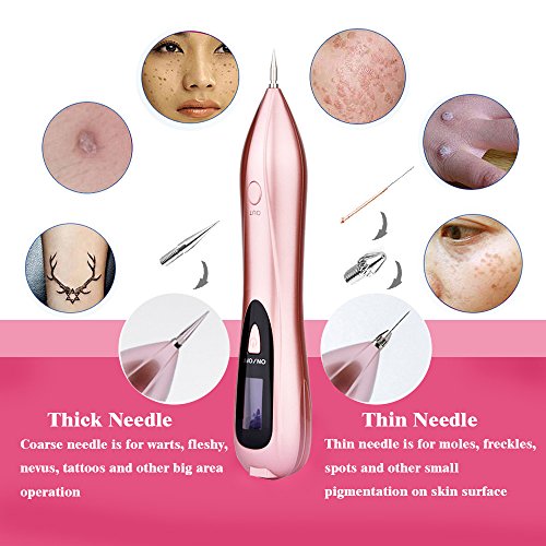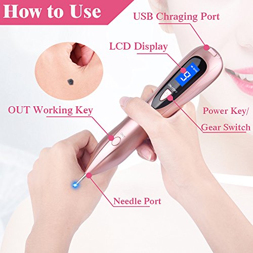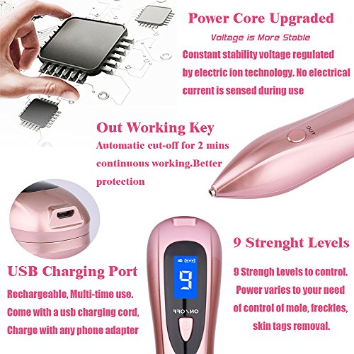 -. Feature : INCREASED STRENGTH - Upgrade system of highest strength in the market, perfect for big skin tag and mole, especially suitable for people who have skillful operation. And it's still recommended that you start in low strength for much easier and freer practice / MEET ALL OF YOUR NEEDS - Subdivision strength into 9 modes, more delicate care for different skin tolerance if you have moles, freckles, skin tags, verruca vulgaris, granulation tissue and other pigmentation on skin epidermis, immediately make your skin smooth and clean / NO BLEEDING - No feeling of electricity with voltage stability of upgrade chip, battery level can be observed visually on LCD DISPLAY, dexterous manipulation with more steady and safe home use curve design, keeping working over 5 hours on a charge / USAGE: Long-press ON/OFF button for 3s to start, press once to first mode and once to second mode. If you press to sixth mode, press again and it'll be back to the first, the working mode can be showed on display. This device will keep working when you keep pressing OUT button, but it has power-off protection if you keep pressing it over 2 min once / NOTE: Cleaning the needle with alcohol, gently sweeps from back to front within a small area, it'll be better if you do a testing on apples or arms before use. Do not stop in one place to avoid burning your dermis layer. Clean your eye spots in twice or more times carefully and don't eat soy sauce during recovery