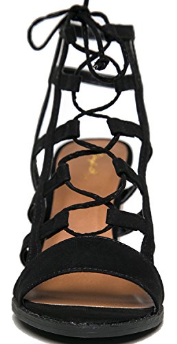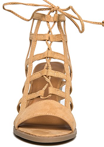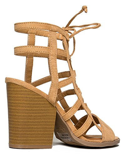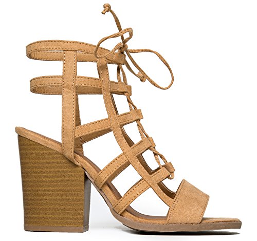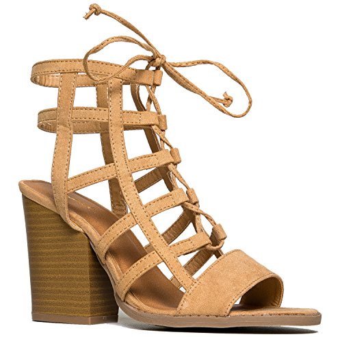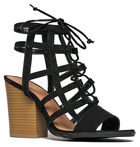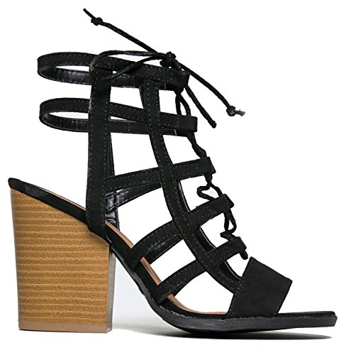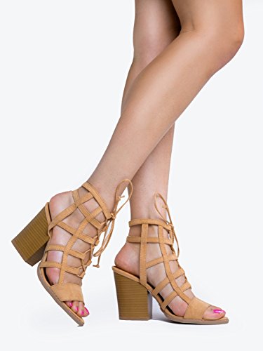 Product Description Glam up your everyday look with these caged heels! Lace up sandals are made from the best vegan suede and are very comfy with it's stacked, block heel and open toe design. 0