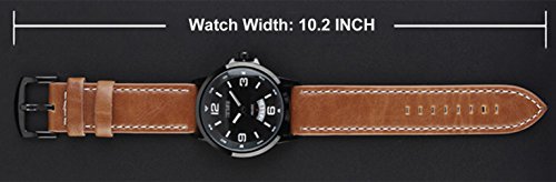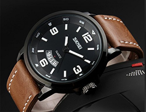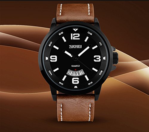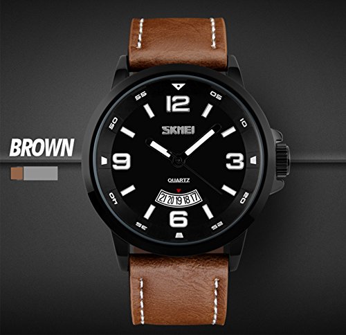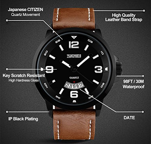 Product Description Highlights: ? Original Japanese CITIZEN Quartz Movement: provide precise and accurate time keeping ? Easy to Read White Time Mark ? Key Scratch Resistant Watch Face ? Stainless Steel Case Cover ? Leather Watch Band Strap ? Calendar Date Window Phase ? 98FT / 30M Water Resistant - 3ATM: Daily Use Waterproof, Hand Wash, Shower, NO Problem. (Please DONOT PULL OUT the button under water) ? Combines quality, leading edge fashion, and value. Features ? Leather Watch Band Strap ? Key Scratch Resistant Watch Face ? Calendar Date Window Phase ? 98FT / 30M Waterproof ? Easy to Read White Time Mark Material: ? Case Material: Stainless Steel ? Band Material: Synthetic Leather ? Mirror Surface: German High Hardness Mineral Glass (Key Scratch Resistant) Specification: ? Dial Color: Black ? Dial Case Diameter: 1.9 inch / 4.8 cm ? Dial Case Thickness: 0.5 inch / 1.1 cm ? Band Color: Brown ? Band Width: 0.9 inch / 2.3 cm ? Band Length: 10.2 inch / 26 cm. ? Maximum Perimeter Wrist Fit: 9.2 inch / 23.5 cm ? Minimum Perimeter Wrist Fit: 7.6 inch / 19.5 cm ? Band Clasp Type: Buckle ? Watch Weight: 2.8 oz / 80 g **NOTE**: ? Please DONOT PULL OUT the Button Underwater. Use in extreme Hot or Cold temperature will shorter watch life. ? If mist or droplets found inside watch surface, please contact manufacturer immediately. ? Clean the leather strap by a soft cloth on regular bases is highly recommended. ? Too much water contact will damage the leather watch band and shorter watch life. What Is In The Package: ? Aposon Business Casual Leather Band Sport Watch x 1 0