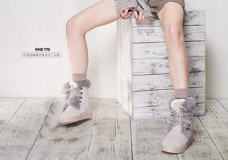 新款牛皮雪地靴女保暖中筒靴奢华兔毛马丁女靴女鞋子