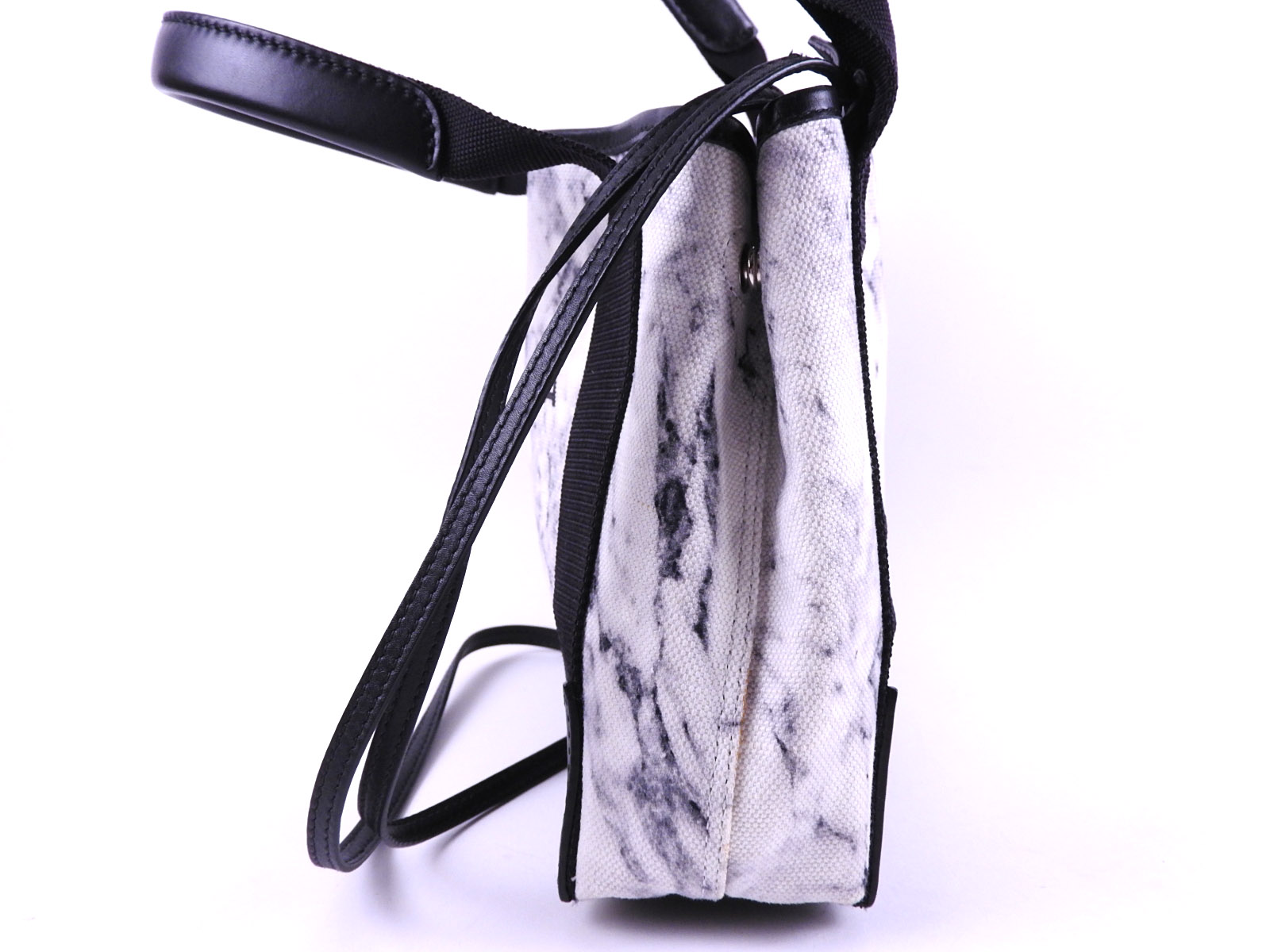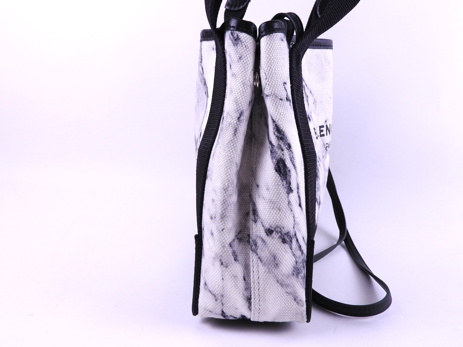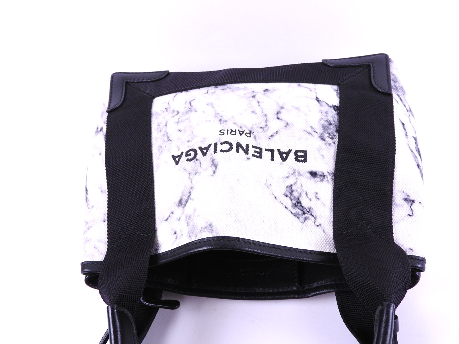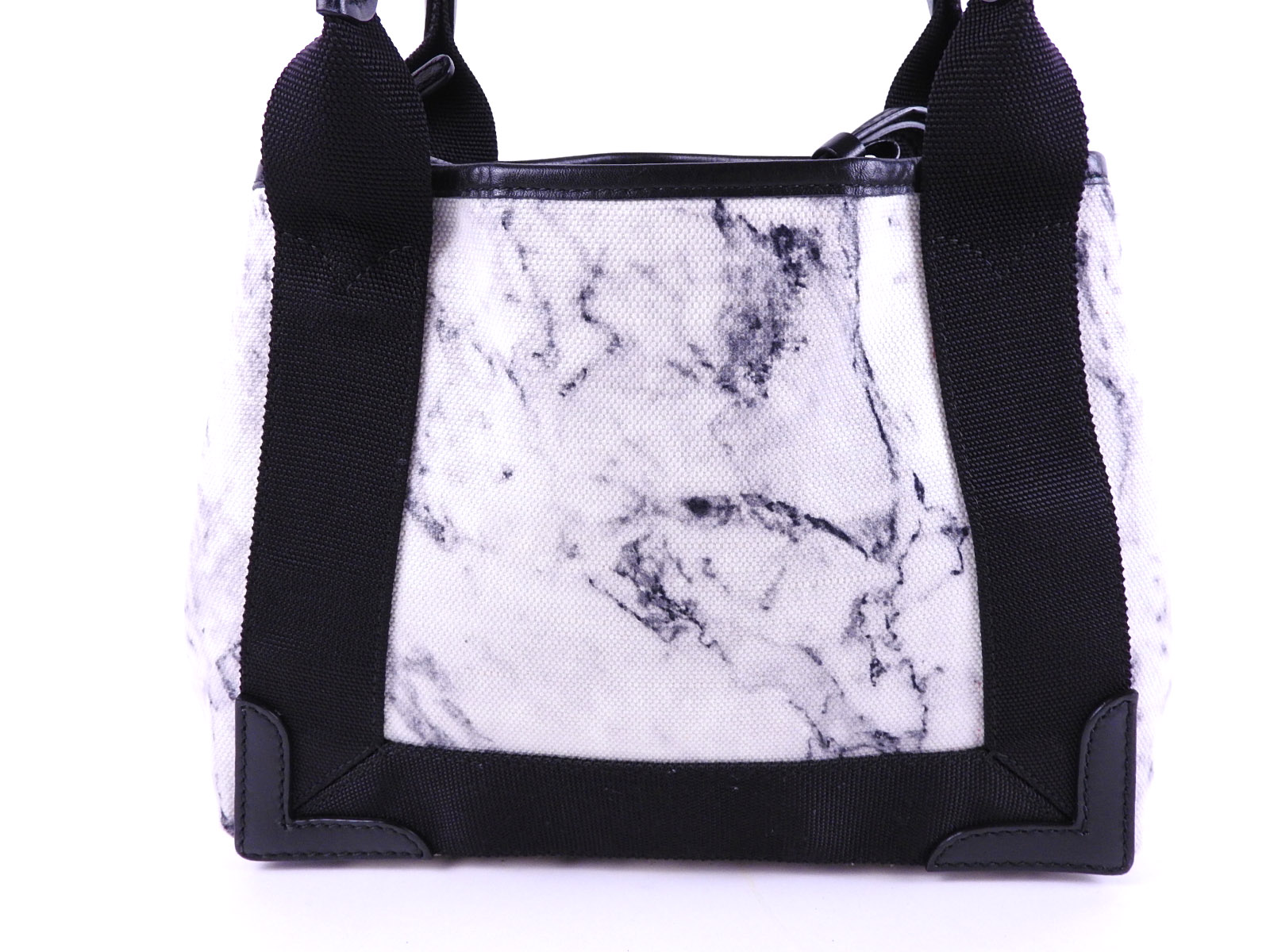 Auth BALENCIAGA Navy Cabas XS 2Way Shoulder Tote Bag With Pouch Leather Canvas Marble White Black 390346 A-7569