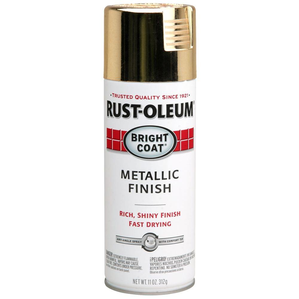 Rust-Oleum Bright Coat Metallic Finish Spray creates a decorative look for indoor projects. Apply to metal, wood, concrete or masonry for a shiny, metallic finish. Use to create distinctive lamps, planters, pottery and more. It features a comfort tip with a wider finger pad to reduce fatigue caused by continuous spraying. In addition, thereâs an any-angle spray feature that allows you to spray in any direction, even upside-down.