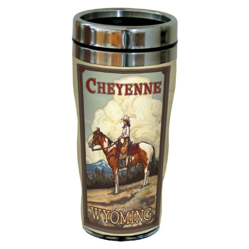 Tree-Free Greetings strives to use the most eco friendly materials and processes possible. Printed and assembled in the USA, the Tree-Free Greetings 16 Ounce Stainless Steel Sip 'N Go Travel Tumbler is vibrantly printed with Vintage Cheyenne Wyoming Cheyenne Cowgirl art and is great for everyday use. It is reusable therefore eliminating disposable paper, plastic or Styrofoam cup waste. This premium quality 16-ounce travel tumbler for hot or cold beverages is BPA free and proposition 65 compliant. With a stainless steel inner and curved acrylic outer, this tumbler is hand wash only, not dishwasher safe. Paul A. Lanquist ("Pal")'s highly sought after art makes a wonderful gift or souvenir. Save trees and spread joy. Buy a Tree-Free earth-friendly gift today.Feature
