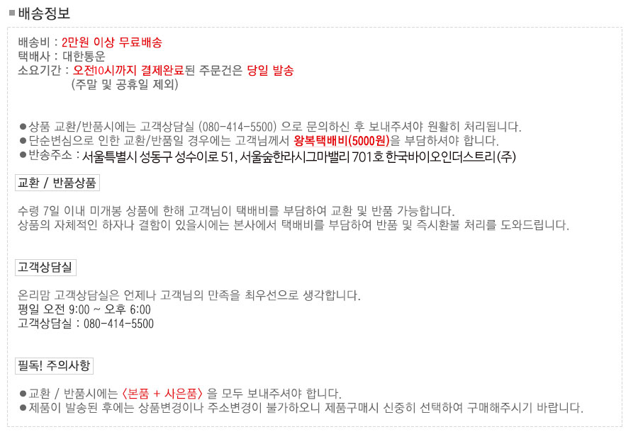 제품 이상시 구입 1개월내에 구입처 또는 한국바이오인더스트리 고객센터를 통해 교환 또는 환불을 받을 수 있습니다. |