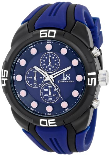 Black ion-plated base metal case with a blue and black silicone strap. Fixed black ion-plated bezel. Blue dial with luminous silver-tone hands and dot hour markers. Minute markers around the outer rim. Dial Type: Analog. Luminescent hands and markers. Chronograph - three sub-dials displaying: 60 second, 60 minute and 1/10th of a second. Quartz movement. Scratch resistant mineral crystal. Screw down case back. Case diameter: 49 mm. Case thickness: 16 mm. Round case shape. Band width: 25 mm. Band length: 9 inches. Tang clasp. Water resistant at 10 meters / 33 feet. Functions: chronograph, hour, minute, second. Sport watch style. Watch label: Hong Kong. Joshua Sons Chronograph Blue Dial Black and Blue Silicone Mens Watch JS61BU.Feature